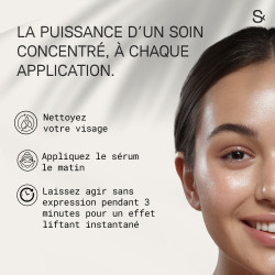 Lightly tap a very thin layer on the areas to be treated. The product must remain moist on the skin. To produce spectacular results, you should avoid any expression for 1 to 3 minutes. Results can be seen quickly. The serum remains effective for 8 to 10 hours. Just a few drops are enough to give you new youthfulness! Avoid the eye contour area.