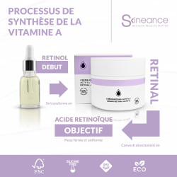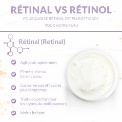 Le Rétinal n'a besoin que d'une seule seule étape pour se transformer en acide rétinoïque (forme active de la vitamine A), c'est pourquoi il est 11 fois plus efficace que le rétinol.