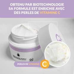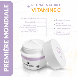 PREMIERE MONDIALE : Rétinal d'origine naturelle et liposoluble avec de la vitamine C encapsulée dans de délicates sphères libérées au contact de la peau.